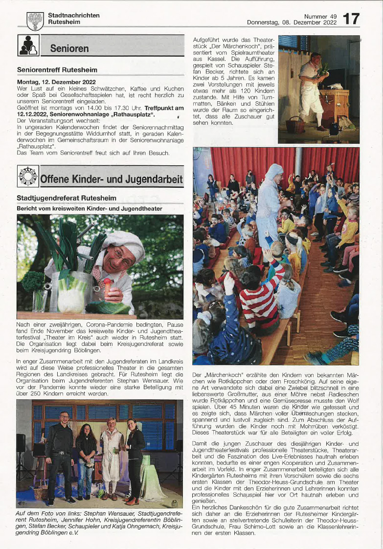 Nach einer zweijährigen, Corona- Pandemie bedingten, Pause fand Ende November das kreisweite Kinder- und Jugendtheaterfestival "Theater im Kreis" auch wieder in Rutesheim statt.